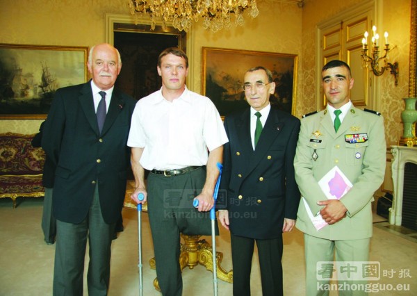 2005年7月14日在法国参议院,原外籍兵团下士长马里乌什·诺瓦科斯基(左二)身边站着的是皮施哈勒议员(左一)和古隆将军(右二)。 (© Centre documentaire Légion Etrangère/Magazine Képi Blanc)