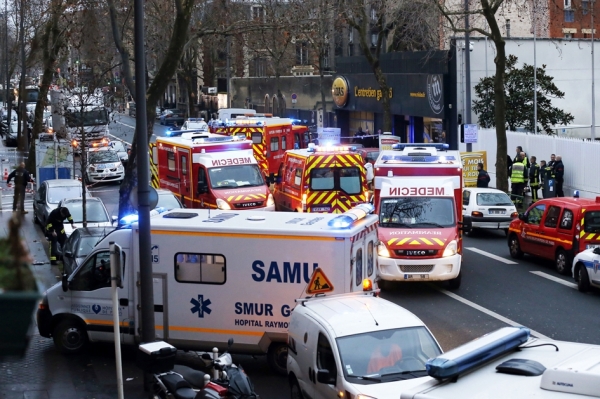 1月8日清晨救护人员和消防队员聚集在Montrouge案发现场。 (AFP/Getty Images)