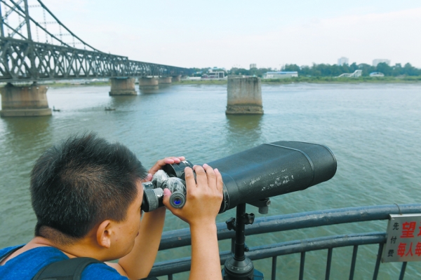 9月5日,一名男子在中国丹东鸭绿江边观察对岸朝鲜。(AFP/Getty Images)