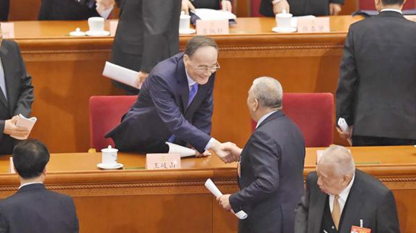 2019年3月两会期间,王岐山和与会者握手,右下握手者为前香港特首董建华。(AFP/Getty Images )