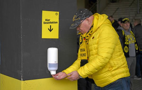 武汉肺炎在德国爆发,图为2月29日,德甲联赛观众洗手消毒。(AFP via Getty Images)