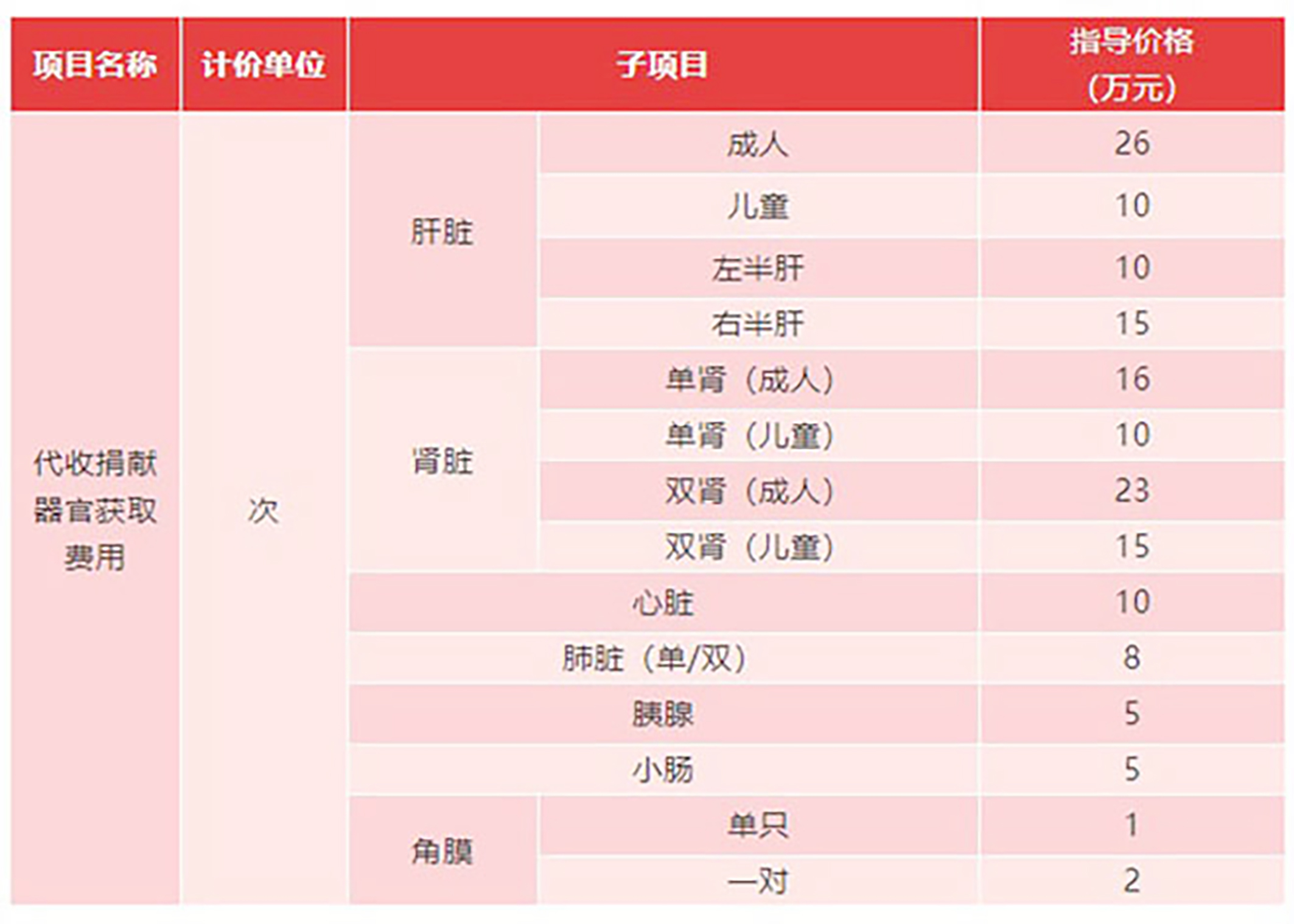 按照全省捐献器官获取收费项目及收费标准,单次代收捐献器官获取费用,成人肝脏指导价为26万元,儿童为10万元,左半肝为10万元,右半肝为15万元。成人单肾指导价为16万元,双肾为23万元;儿童单肾为10万元,双肾为15万元。心脏指导价为10万元。肺脏(单/双)指导价为8万元。胰腺指导价为5万元。小肠指导价为5万元。角膜指导价单只为1万元,一对为2万元。其中,上述儿童指年龄小于18周岁。