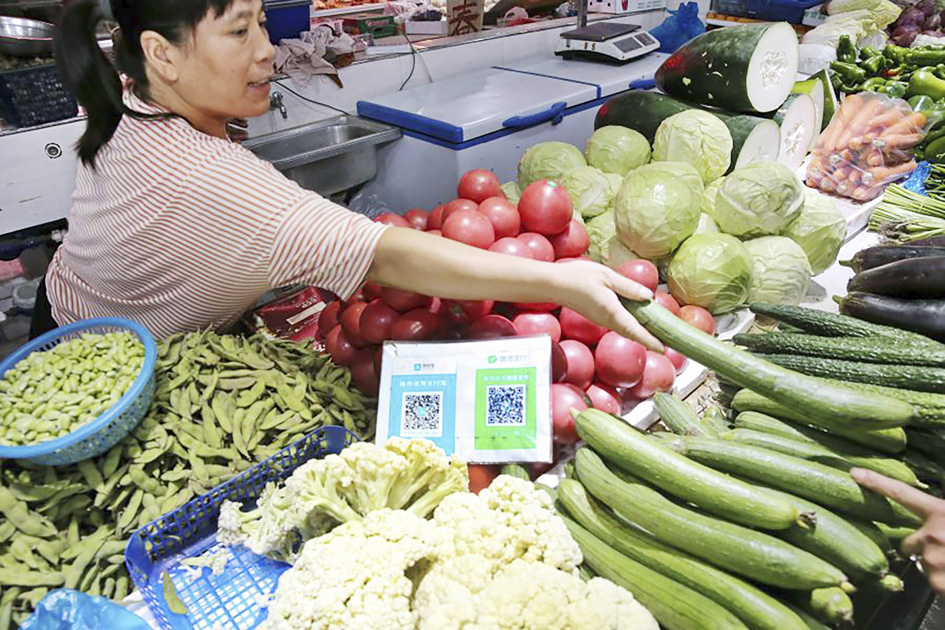 中国江苏省南通市某菜市场,商贩提供支付宝和微信二维码在线支付。(STR/AFP via Getty