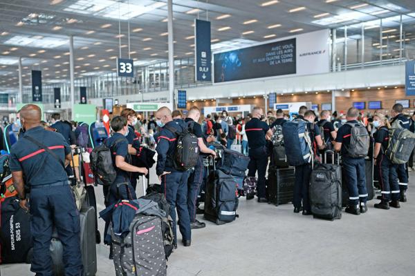 法国志愿消防员在奥利机场准备出发支援。