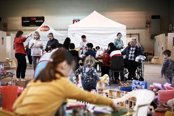2022年4月21日在波尔多一体育馆里休息的乌克兰难民