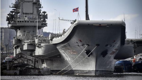 2018年5月19日,俄罗斯航空母舰库兹涅佐夫海军上将停泊在俄罗斯北部港口城市摩尔曼斯克的 Rosatomflot 停泊处。(图片来源:ALEXANDER NEMENOV/AFP via Getty Images)
