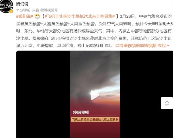 3月27日,有摄影师在飞机上拍摄到沙尘暴来袭时北京上空的景象,提示注意防范,“ 这波沙尘正逼近北京 ” ,提醒早点回家,紧闭门窗。视频显示,沙尘暴袭来遮住天空,天昏地暗,一名男子多遍惊呼,“ 哎呀我的天哪!” “ 怎么又变成这样啦!谁懂啊?家人们谁懂啊!”