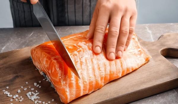 大块鲑鱼排可依平时习惯的烹调尺寸切分,分块密封包装后,再放入冷冻室。