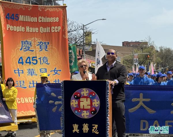 法轮大法信息中心发言人张而平说: 今天我们非常高兴能够在法拉盛,这是个华人社区,很多中国人都来自中国大陆。你们之所以住在这儿,也是为了逃避共产党独裁和专制,否则的话你也没必要住在这个远离家乡,背井离乡住在这里。
