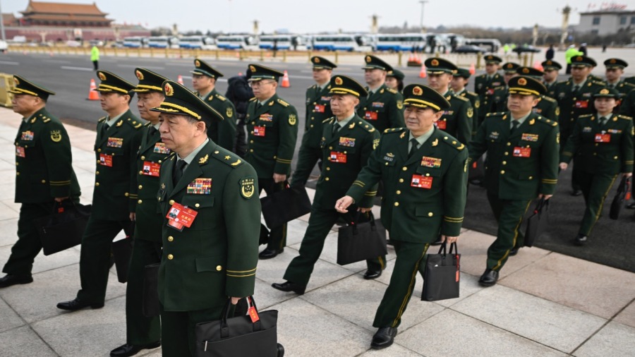 2024年3月4日,中共人民政治协商会议(CPPCC)开幕式前,军事代表 团成员抵达北京人民大会堂参加会议。(图片来源:Getty Images)