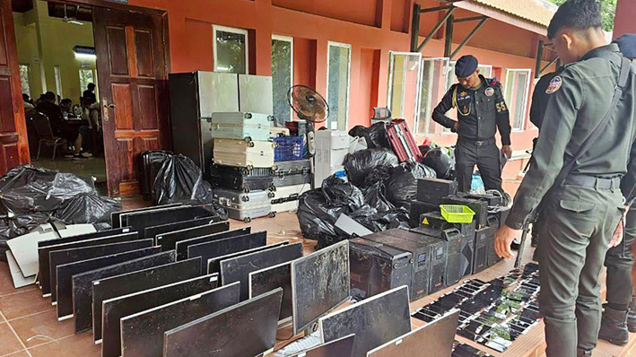 7月17日,柬埔寨军警正在查看在干丹省一处诈骗中心突袭行动中缴获的电脑、智能手机和其它设备。(STR/POOL/AFP via Getty Images)