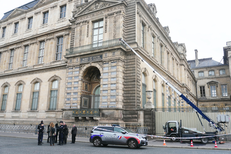 10月19日,数名盗贼通过升降机到达卢浮宫阿波罗画廊外侧的阳台,翻窗进入馆内盗走八件法国王室珍品。(DIMITAR DILKOFF/AFP via Getty Images)