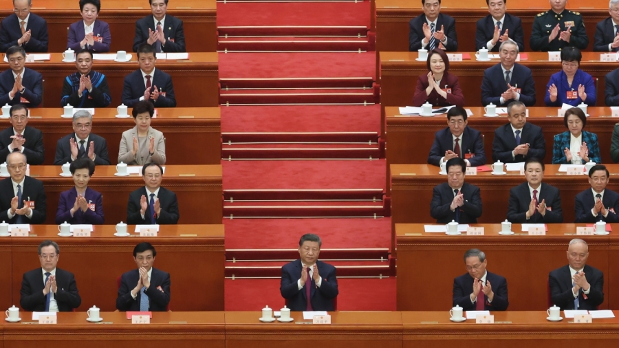 2025年3月11日,中共党魁习近平(中)、国务院总理李强、常委王 沪宁、中共中央政治局常委蔡奇、国务院副总理丁薛祥在中国北京人 民大会堂出席第十四届全国人民代表大会第三次会议闭幕式。 示意图。(图片来源:Lintao Zhang/Getty Images)