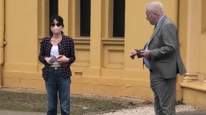 杨兰兰替身从悉尼警局出来后,被《每日邮报》拦下询问。 (图片来源:网络图片)