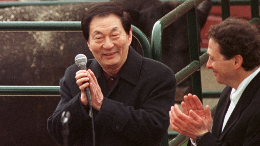 1999年4月11日,中共国务院总理朱镕基(左)在伊利诺伊州 利伯蒂维尔的马雷尔巴农场向农民发表讲话时与汤姆 • 普利兹 克一起鼓掌。 (图片来源:TANNEN MAURY/AFP via Getty Images)